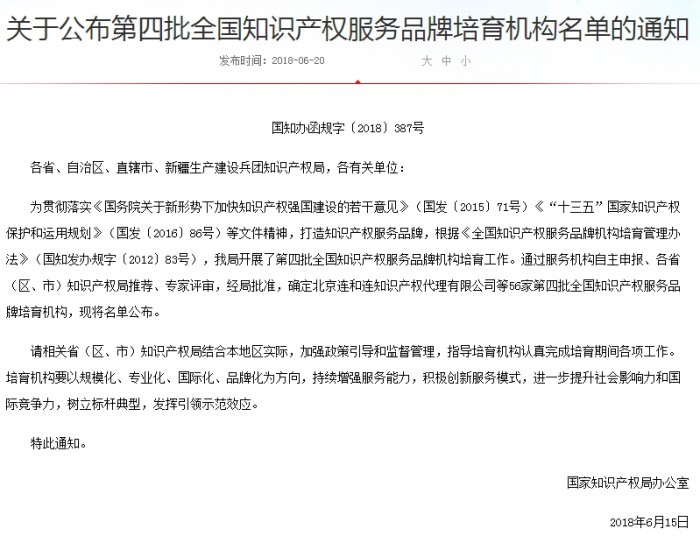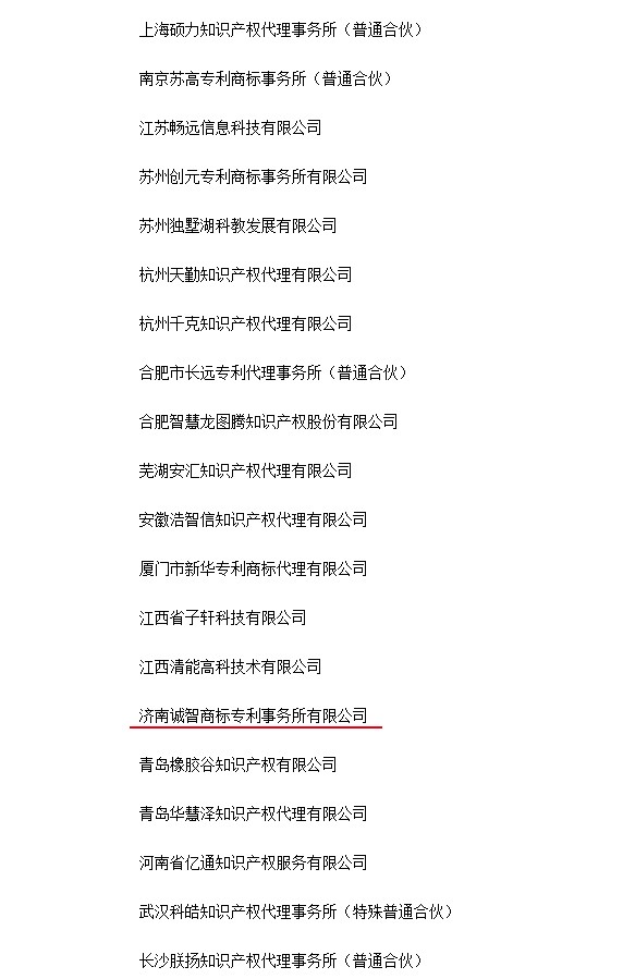 2018年6月19日國家知識產權局發出通知,公布了入選第四批全國知識產權服務品牌培育機構的名單,濟南誠智商標專利事務所有限公司成功入選,通知內容如下: